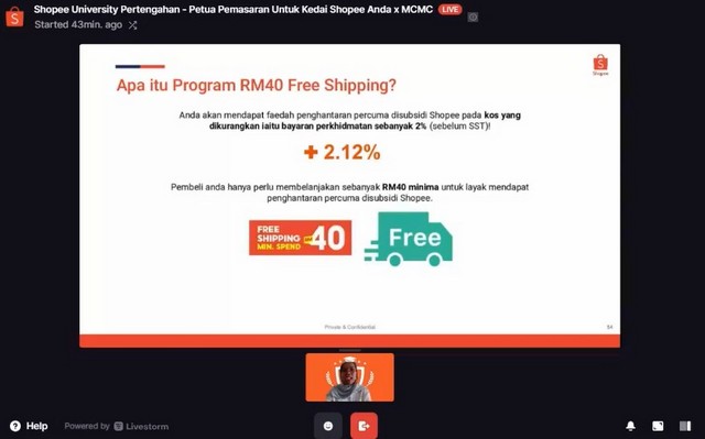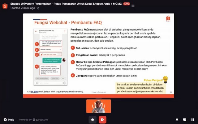 Program ini adalah secara atas talian melalui pihak Shopee sebagai tenaga pengajar dengan kerjasama MCMC. Usahawan yang menjadi peserta di dalam kempen ini bakal mendapar pelbagai faedah yang ditaja oleh MCMC antaranya seperti Baucher diskaun, Baucher kedai dan Baucher penghantaran percuma. Program ini diadakan pada sebelah pagi bermula pada jam 10.00 pagi hingga 12.00 tengah hari. Program ini khusus untuk mereka yang mengikuti Kelas Basic Shopee pada 2 Ogos lalu. Tapi ada pertambahan dalam modul seperti Pengiklanan, WebChat, Tawaran Bundle, Free Shiping RM 15, RM40 dan pelbagai lagi. Di harapkan kelas keusahawanan ini dapat membantu usahawan yang baru berjinak dalam perniagaan Shopee untuk terus maju jaya dalam perniagaan.