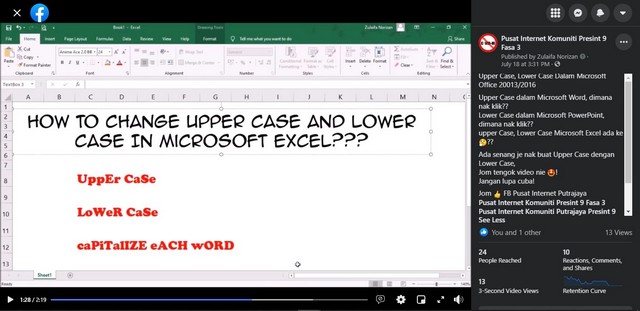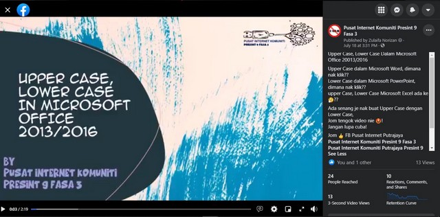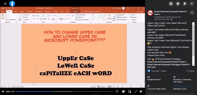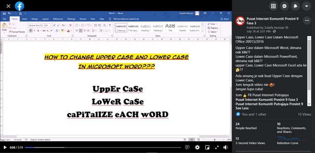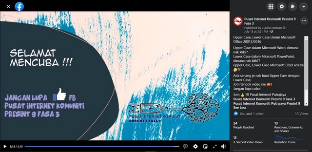 21 Julai 2021, Rabu– Staff pengurusan Pusat Internet Komunti Presint 9 Fasa 3 telah berkongsi video tutorial di Facebook mengenai tip meggunakan Upper Case dan lower case didalam Microsoft Office (Word, PowerPoint dan Excel). Video ini sangat berguna untuk pelajar atau pekerja untuk mempercepatkan kerja dengan menggunakan fungsi-fungsi yang disediakan oleh Microsoft Office. Diharapkan video ini dapat memberi sedikit ilmu tambahan kepada followers Facebook Pusat Internet. Seramai 24 orang followers Facebook Pusat Internet Komunti Presint 9 Fasa 3 telah melihat video tutorial setakat 72 jam dikongsi.