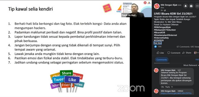 3 November 2021 | Aktiviti Terkini2 November 2021, Selasa – Staff pengurusan Pusat Internet Komuniti Presint 9 Fasa 3 telah menyertai sesi live bersama pihak MCMC iaitu dalam Program Bicara Klik Dengan Bijak (Risiko Dan Impak Terlebih Kongsi).