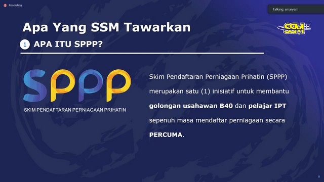 8 Oktober 2021 | Aktiviti Terkini7 Oktober 2021, Khamis – Seramai 77 orang staf Pusat Internet Komuniti (PIK) Wilayah Persekutuan Kuala Lumpur, Labuan dan Putrajaya telah menyertai Sesi Penerangan Skim Pendaftaran Perniagaan Prihatin (SPPP) oleh SSM bersama PIK di Wilayah Persekutuan. Program ini merupakan kerjasama Suruhanjaya Komunikasi dan Multimedia Malaysia (SKMM) dengan pihak Suruhanjaya Syarikat Malaysia (SSM) yang menawarkan Skim Pendaftaran Perniagaan Prihatin (SPPP) untuk golongan B40 dan Pelajar Institut Pengajian Tinggi (IPT) Malaysia.