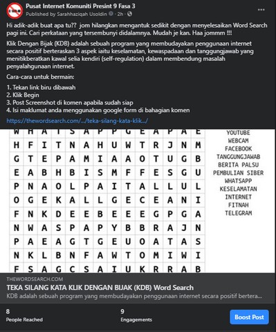 9 Februari 2021 | Aktiviti Terkini9 Februari 2021, Jumaat – Pusat Internet Komuniti Presint 9 Fasa 3 telah berkongsi 1 teka silang kata di Facebook Pusat Internet Komuniti Presint 9 Fasa 3. Klik Dengan Bijak adalah sebuah program yang membudayakan penggunaan internet secara positif berteraskan 3 aspek iaitu keselamatan, kewaspadaan dan tanggungjawab yang menitikberatkan kawal selia kendiri (self-regulation) dalam membendung masalah penyalahgunaan internet. Terdapat beberapa perkaatan bermakna yang perlu dicari oleh followers Facebook. Aktiviti ini diharapkan dapat membudayakan penggunaan internet secara positif dalam kalangan followers Facebook. Seramai 9 followers telah menyertai aktiviti ini.